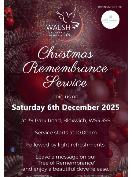 Walsh Funerals & Memorials in vite everyone to join them in this special moment of reflection, love and unity during the festive sea son. For more information about the event or to let the team know you plan to attend, you can contact Walsh Funerals & Memorials directly