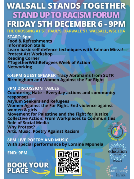 On Friday 5th December Walsall Stands Together - Stand Up To Racism are holding an event at The Crossing at st Pauls in Darwall Street, Walsall between 6pm - 9pm.