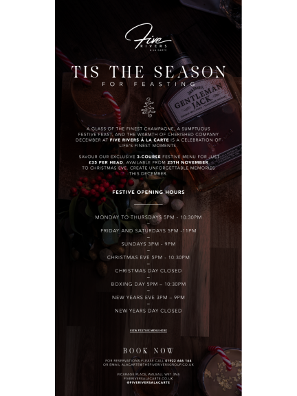 Celebrate the most wonderful time of the year in style at Five Rivers À La Carte, Walsall’s award-winning fine dining Indian restaurant. Enjoy a glass of the finest champagne, a sumptuous festive feast, and the warmth of cherished company this December.