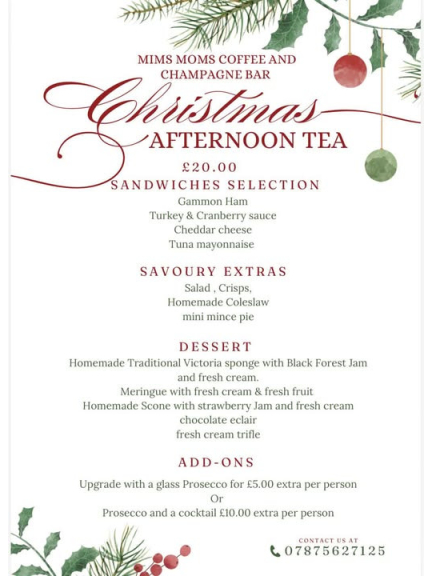 Indulge in a magical holiday experience at Mims Moms Coffee and Champagne Bar with a delightful Christmas Afternoon Tea for just £20.00. 🎄☕🥂