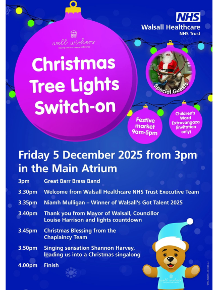Walsall is gearing up for a heart-warming festive celebration as Walsall Healthcare NHS Trust hosts its Christmas Tree Lights Switch-On on Friday 5 December 2025. Taking place from 3pm in the Main Atrium, the event promises an afternoon filled with joy, community spirit and Christmas entertainment for visitors of all ages.