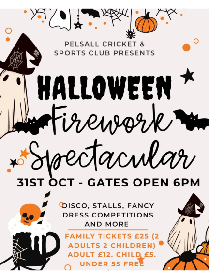 Join us at Pelsall Cricket & Sports Club for a Halloween Firework Spectacular on 31st October! ππΈοΈ