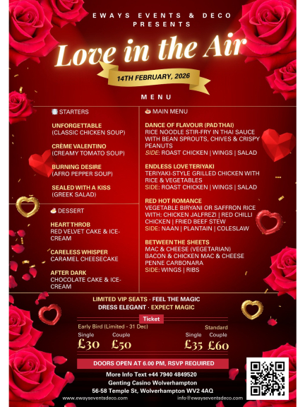 Presented by Eways Events & Deco, this elegant evening takes place on Saturday 14th February 2026 at the stunning Genting Casino Wolverhampton, just a short drive from Walsall.