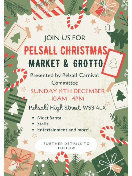 ✨🎄 Get into the holiday spirit at the Pelsall Christmas Market & Santa’s Grotto, proudly presented by the Pelsall Carnival Committee! 🎅✨