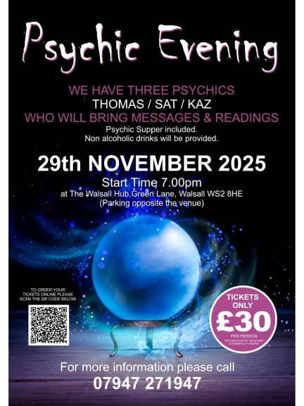 A captivating Psychic Evening is taking place at The Walsall Hub on Saturday 29th November 2025, bringing together three talented psychics – Thomas, Sat and Kaz. Throughout the night, guests will receive messages and readings, offering guidance, comfort and insight in a warm and welcoming setting.
