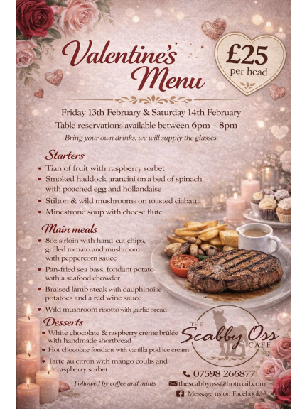 Treat your special someone to a romantic Valentine’s Menu at The New Scabby Oss Café ❤️🍽️. Available to book for Friday 13th & Saturday 14th February, with tables available from 6pm–8pm, and enjoy a delicious three-course menu for £25 per head 💖. From tempting starters to indulgent mains and irresistible desserts 🍫🍓, it’s the perfect way to celebrate love. Bring your own drinks 🥂 ✨